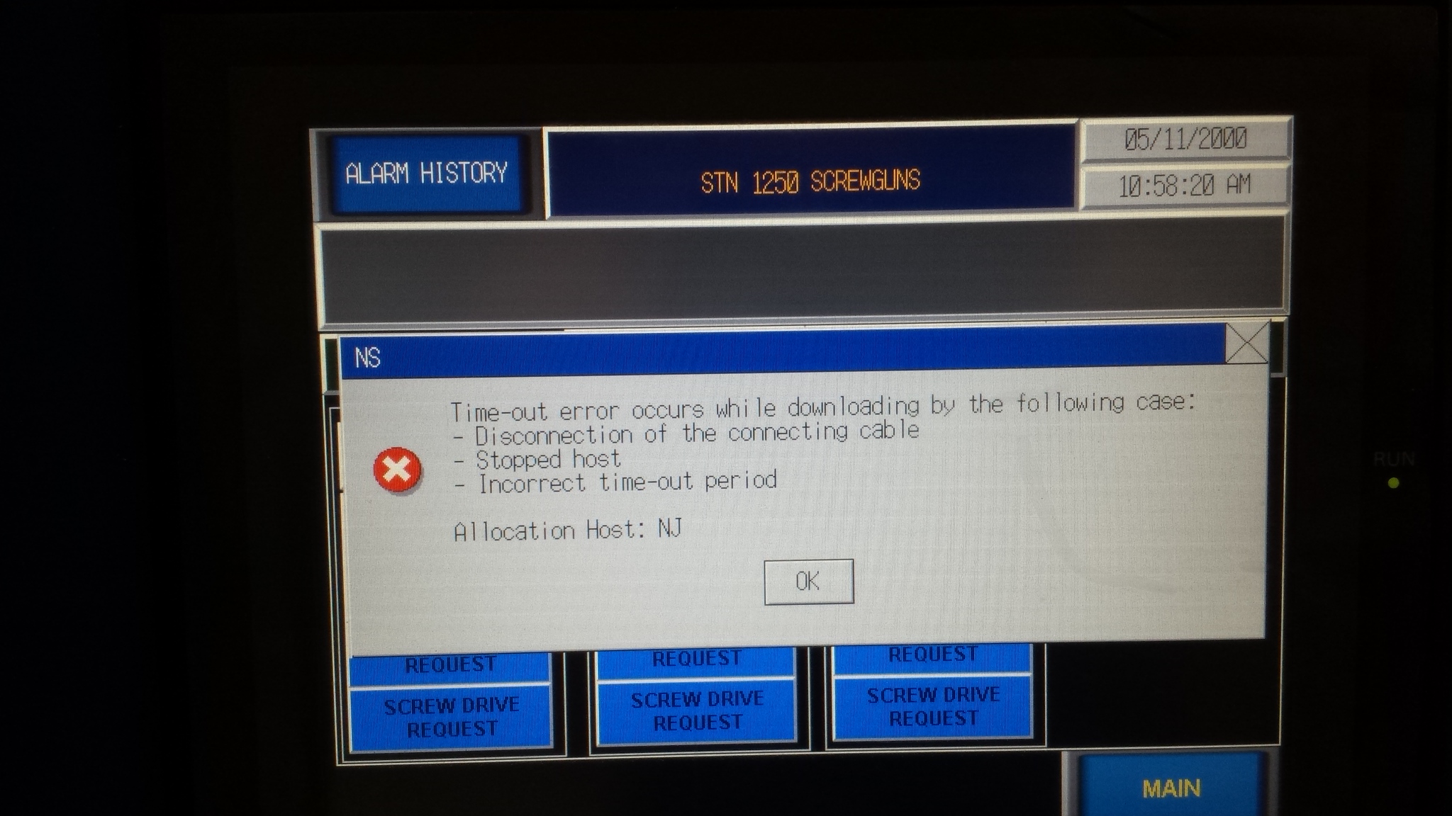 Ken Adams Posted March 27, 2017 Report Posted March 27, 2017 I am having issues with NS screen,after 10 minutes of being active and communicating with NJ plc screen will pop up and display following error message. Time-out error occurs while downloading by the following case: -Disconnection of the connecting cable -Stopped host -Incorrect time-out period Allocation Host: NJ Any idea anybody? Screen shot is also attached for viewing.