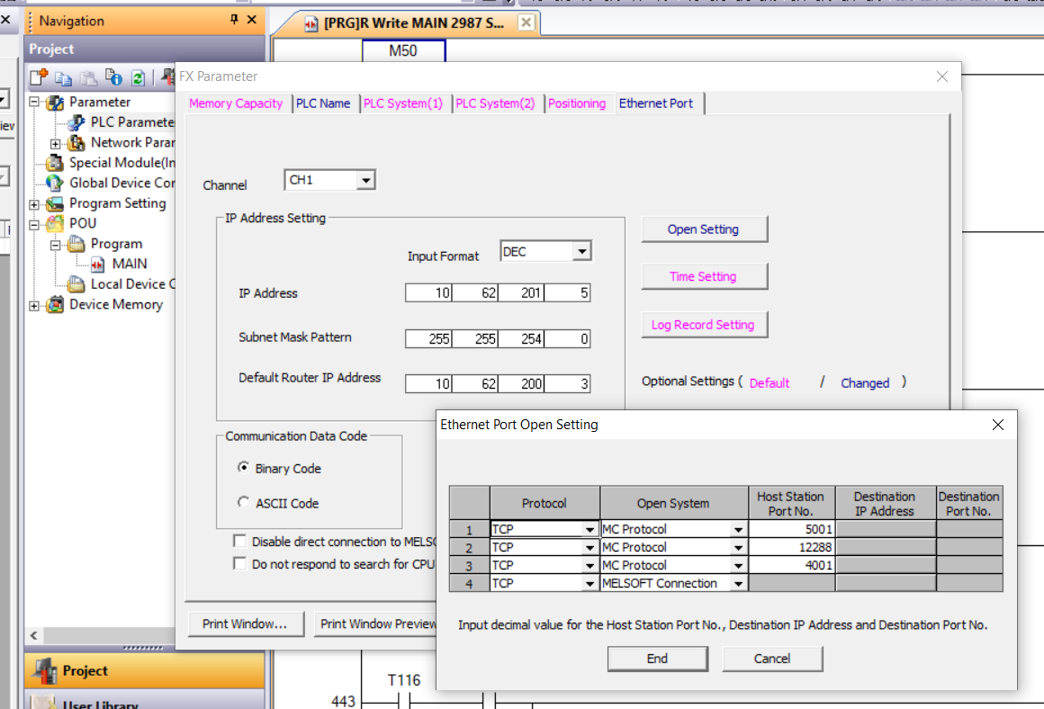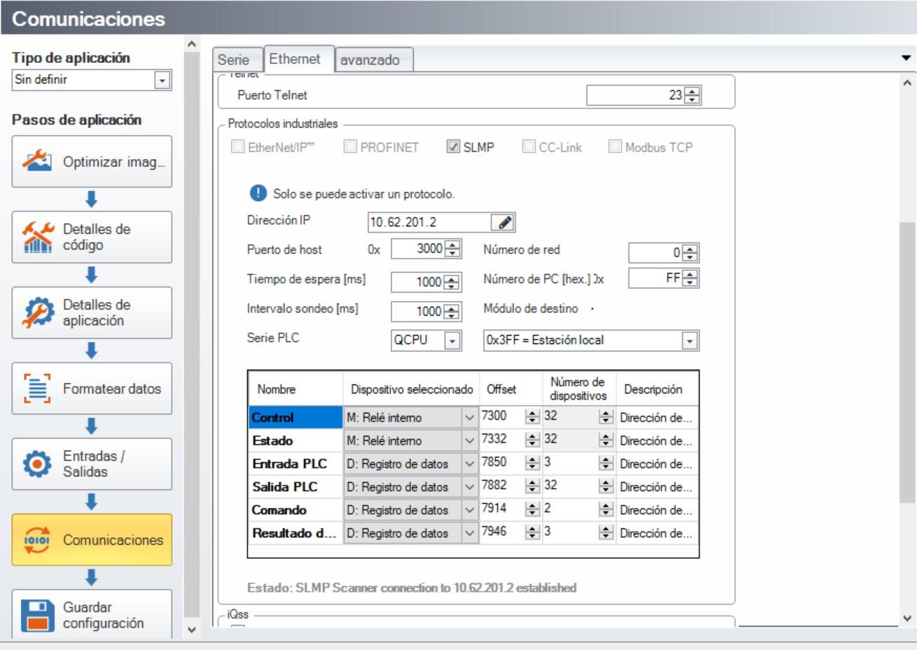 Josue Badillo Posted September 3 Report Posted September 3 Hola! te puedo mostrar un ejemplo que tal vez te ayude, es similar la aplicacion que quieres hacer Estoy trabajando en un proyecto de trazabilidad, en esta linea de produccion exiten 13 estaciones de trabajo, cada estacion cuenta con su PLC Mitsubishi, depende la estacion varia el plc, Unos tienen FX3U. FX3G, FX5UC y otros Qseries En este trabajo se integraron Camaras DataMan 290. este es un lector de códigos de barras de la marca COGNEX, dentro del software DATAMAN setup tool, el protocolo disponible para Mitsubishi es SLMP, aqui en esta parte se pone la direccion IP del PLC tanto como la del lector y el puerto de comunicacion (puerto host 0x = 3000 , valor en hexadecimal que en decimal es 12288) que se va a utilizar, tambien se mapea las entradas, salidas y marcas que se pueden utilizar con este lector Referente a tu duda, Yo utilice los modulos FX3U-ENET-ADP y FX3G-CNV-ADP para los PLC´s FX3U, para los FX5 y los Qseries ya no es necesarios dichos adaptadores, Dentro del programa de GXWORK 2 en la parte de parametros, asignamos Direccion IP, mascara y puerta de enlace, tambien se tiene que agregar el tipo de protocolo de comunicacion y el puerto como se ve en la imagen: En este ejemplo puse la Camara cognex en el canal 2, donde sale el puerto 12288, Los demas canales los utilice para comunicacion con Kepserver y otro sensor (5001 y 4001) Espero que pueda servirte de ayuda, Saludos desde MX, San luis Potosi! 1